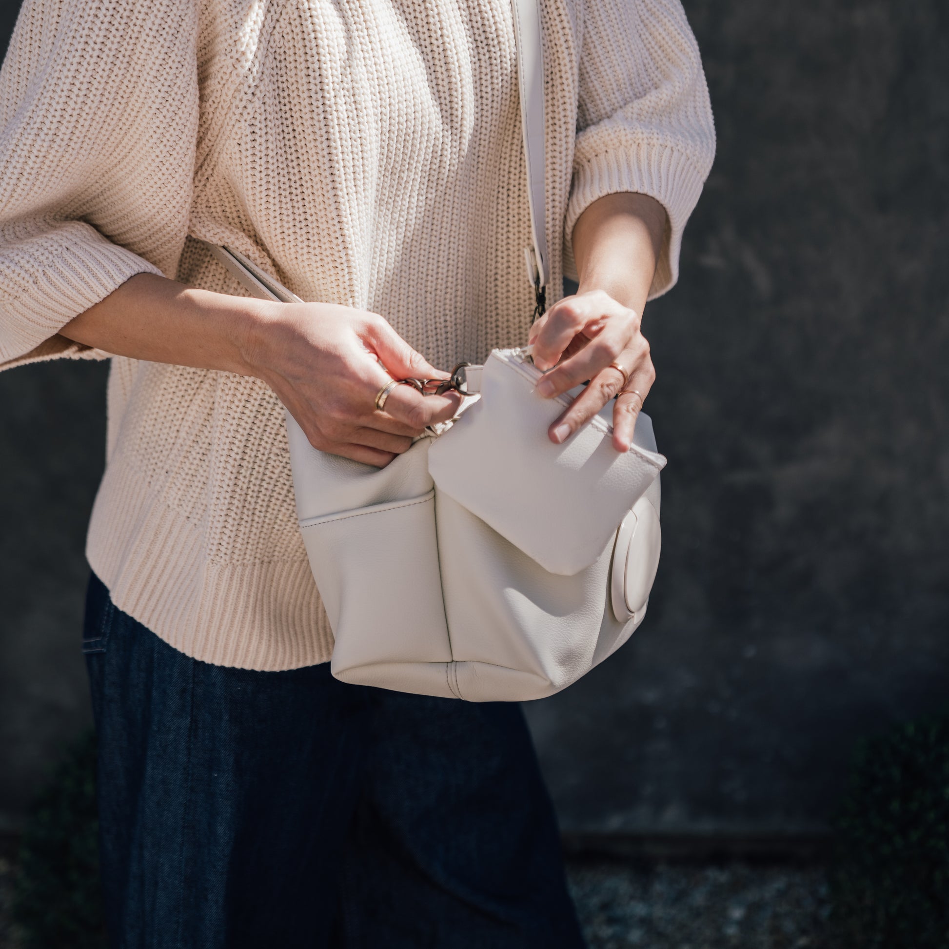 Its waterproof interior makes it perfect for storing pacifiers (fits up to two), while also working beautifully as a compact pouch for credit cards, keys, or a small lip balm. Whether clipped to your bag or carried on its own, it adds just the right amount of convenience without disrupting the calm, minimal look.